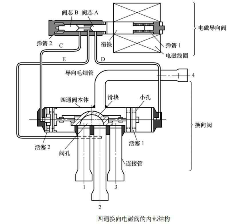 如下图所示,四通换向电磁阀由导向阀和换向阀两部分组成。其中,导向阀由阀体和电磁线圈两部分组成。阀体内部设置了弹簧、阀芯、衔铁,阀体外部有 C、D、E 3 个阀孔,它们通过C、D、E 3 根导向毛细管与换向阀连接。四通换向电磁阀的阀体内设有半圆形滑块和两个带小孔的活塞,阀体外有 4 个管口,它们分别与制冷系统中压缩机的排气管、吸气管、室内外热交换器连接。